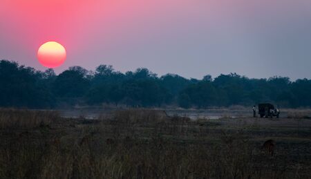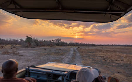 Okavango Delta, Botswana - August 3, 2022. A first-person perspective of a sunset in the Okavango delta, as observed from a Mokoro.