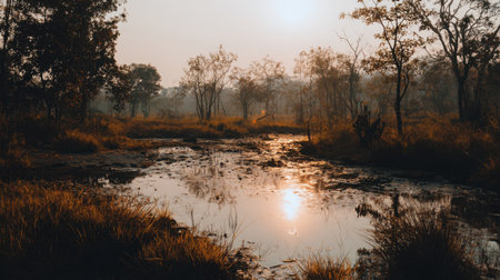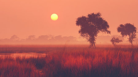A breathtaking view of a serene sunset over a lush marshland, showcasing silhouetted trees and gentle reflections on calm waters, creating a tranquil atmosphere.