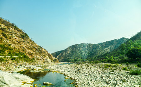 Dry riverbed of a river with rocks and rocky hills on both sides