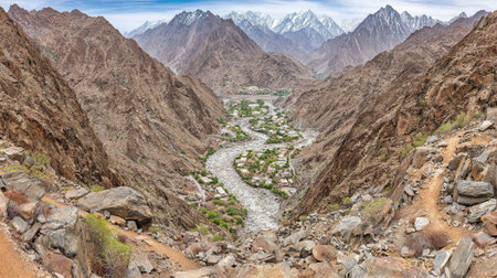 A breathtaking high angle shot of a secluded village in a deep valley, with a river flowing through it, surrounded by arid mountains and distant snowy peaks under a blue sky.