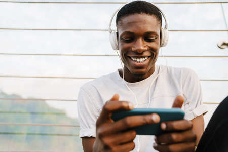 Relaxed smiling african sportsman sitting on the bridge, wearing headphones, using mobile phone