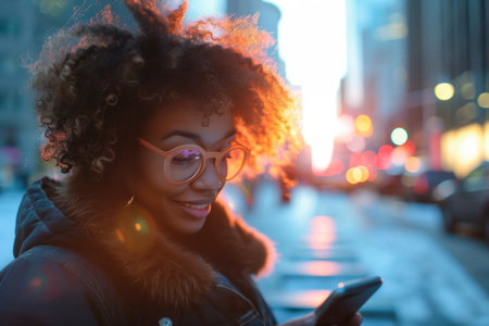 woman using her cell phone in city street.