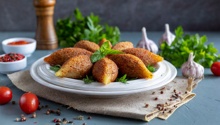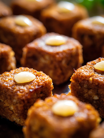 Delicious traditional kibbeh arranged neatly on a rustic plate, garnished with pine nuts and fresh herbs, showcasing a rich cultural dish perfect for sharing at gatherings.