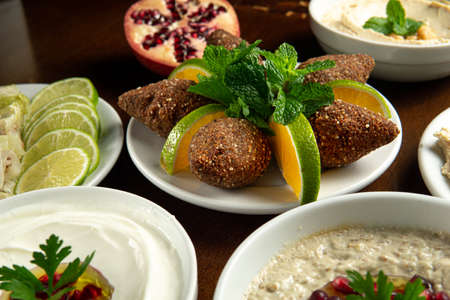 Traditional Middle Eastern food. Lebanese food. Arabian kibbeh with orange, lemon, pomegranate