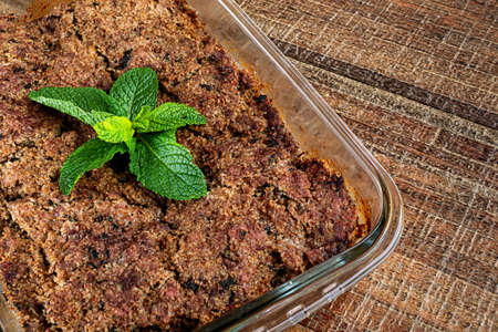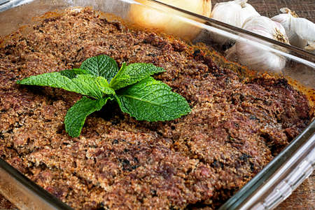 Roasted kibe in the glass bowl with mint, garlic and onion. Brazilian snack (Kibe de Forno). Space for text. Selective focus.