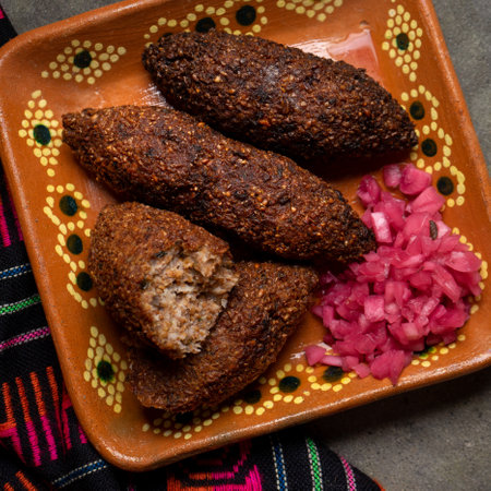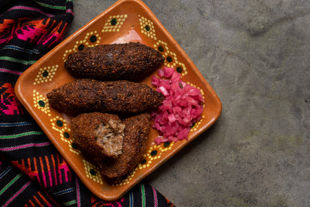 Traditional mexican kibi with meat and onion on rustic background