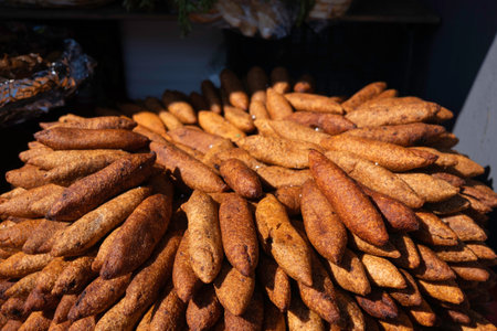 Traditional Turkish Stuffed Meatballs (Kibbeh) at a Market. Golden Brown Heap of Kibbeh for Sale at a Bazaar. Turkish Dish, cuisine. Street food