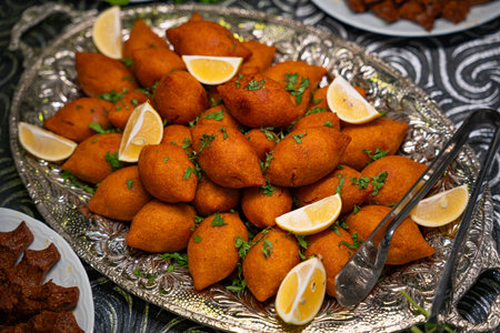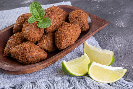 Traditional Turkish and Arap icli kofte served with lemon wedges on silver tray. Golden fried stuffed bulgur meatballs kibbeh. Popular dish in Middle Eastern cuisine