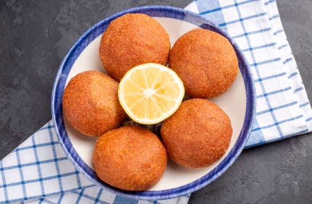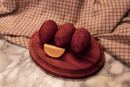 Traditional Spanish tapas croquettes with lemon, top view.