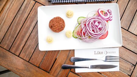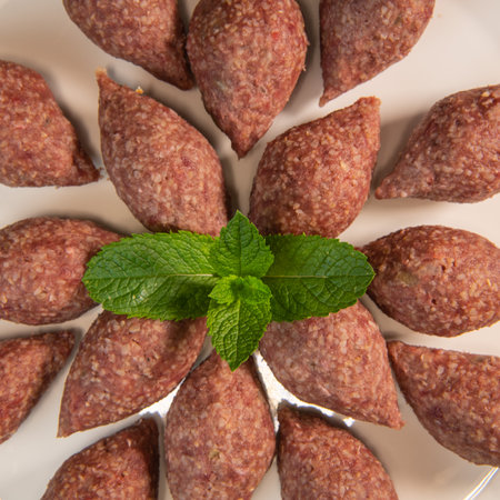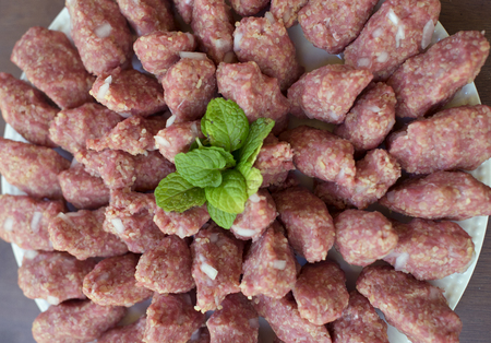 close-up traditional local pistachio style handcrafted raw meatballs with or without spicy meat on navel salad leaves in a white plate