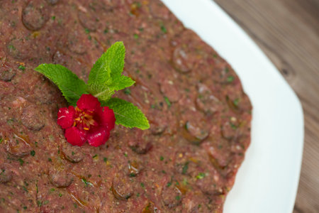 Delicious Lebanese Kebbe Naye garnished with olive oil and fresh mint on a rustic wooden table