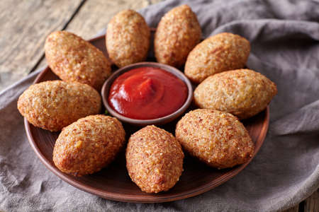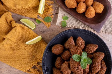 Traditional arabic fried kibbeh over wooden table with copy space. Typical brazilian snack.