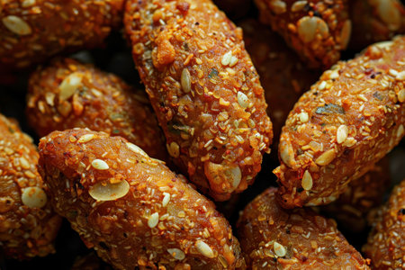 A close-up shot of a pile of fried food items covered in sesame seeds and other spices.