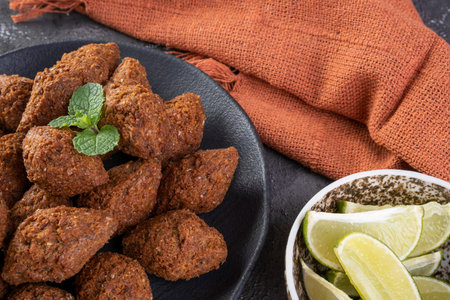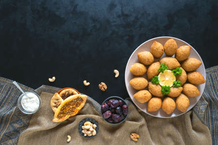 Delicious Lebanese (Arabic) food, kibbeh (kibe) with sauces and lemon on black slate stone and granite background with traditional keffyeh.