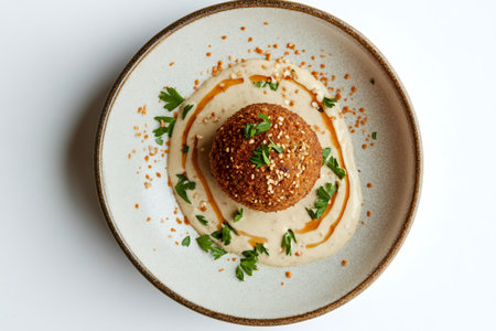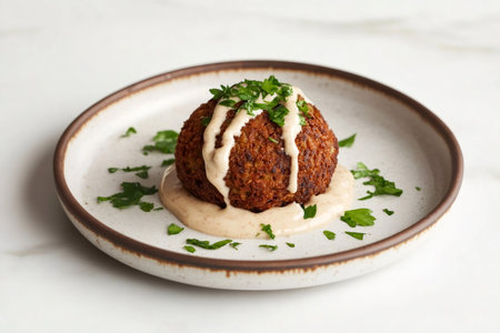 Delicious falafel ball served on a modern plate with tahini sauce and fresh parsley, representing middle eastern cuisine
