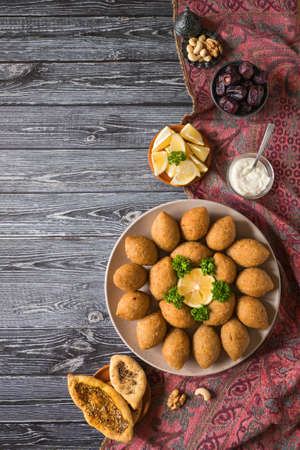 Kibbeh traditional middle eastern oriental restaurant lamb meat stuffed and bulgur kofta spicy meatball croquettes food on vintage wooden table background