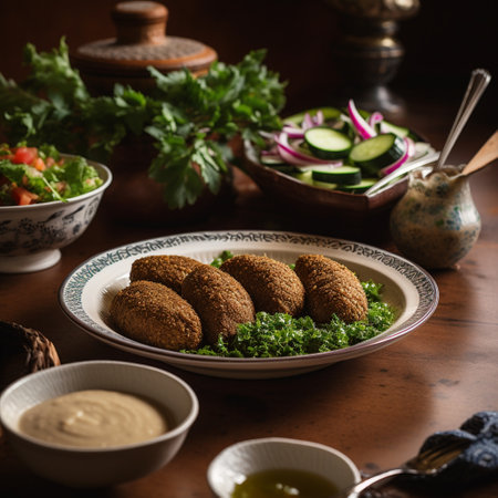 Enjoy the authentic taste of Syrian cuisine with this plate of freshly made Kibbeh, featuring a blend of ground meat and bulgur wheat. Served with traditional ceramic plates and a fresh salad, this dish is sure to satisfy your taste buds.