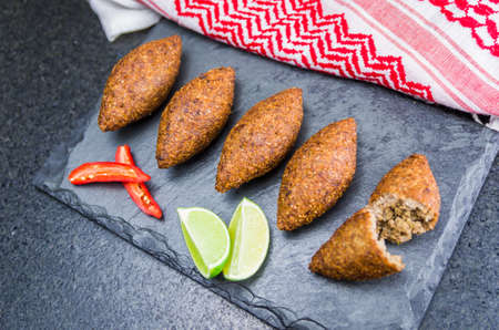 Delicious Lebanese (Arabic) food, kibbeh (kibe) on black slate stone and granite background.