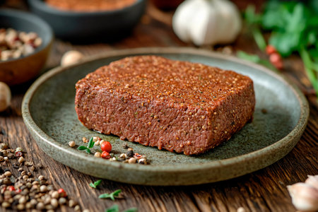 A hearty block of seasoned ground meat sits on a rustic plate, surrounded by spices and fresh herbs, inviting culinary exploration and the creation of flavorful dishes.