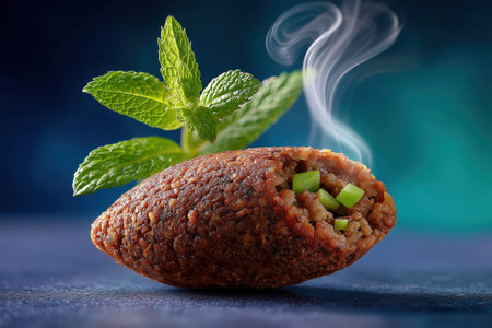 Cracked kibbeh torpedo emits aromatic steam with vibrant green filling. Macro shot captures texture and detail against bold background.