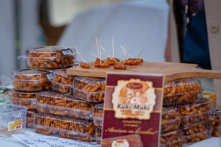 RIGA, LATVIA - JUNE 22, 2018: Summer solstice market. Samples of caramelized corn on the market. Buyers can taste them.