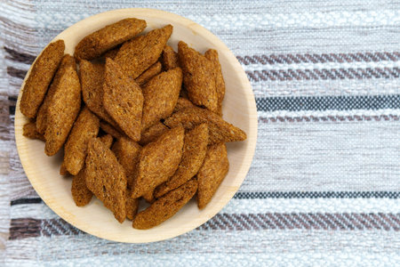 croutons brown pieces of dried bread in bowl. Top view. copyspace