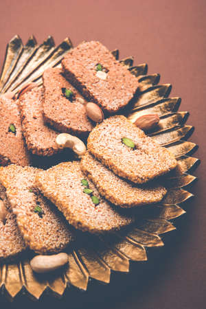 Gajak or til papdi or patti is a dry sweet cake - made of sesame seeds, ground nuts and jaggery, consumed in indian winter especially during Makar Sankranti festival on 14th january