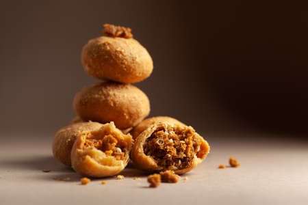 Close-up of freshly baked spicy Dry kachori or crunchy balls filled with spicy dry chutney traditionally authentic Rajisthani and Gujrati.