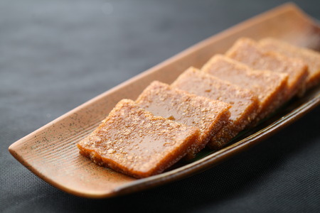 Pieces of tasty sesame kozinaki on dark background