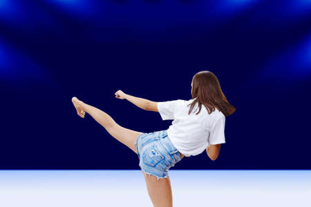 Angry and independent beautiful woman kicking in the air with cloudy sky on the background dramatic shot