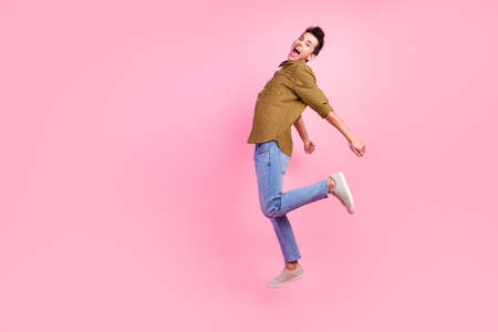 Full length portrait of excited young man in shirt jumping isolated over pastel color background