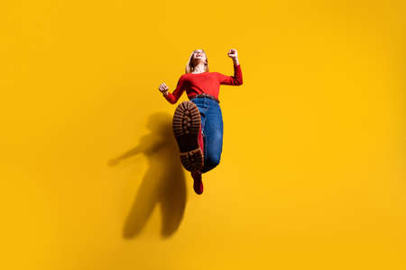 Low below angle full length body size view of her she nice fit thin slim attractive cheerful cheery girl having fun going making step isolated over bright vivid shine orange background