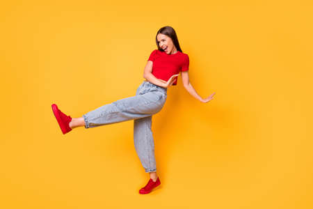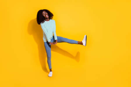 Full body photo of satisfied cheerful young lady raise leg enjoy free time toothy smile isolated on yellow color background