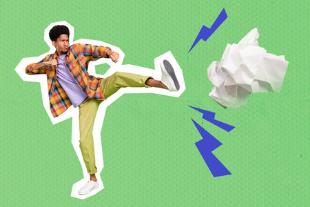 Creative collage image of mini sporty guy leg kick fight big crumpled paper isolated on painted green background