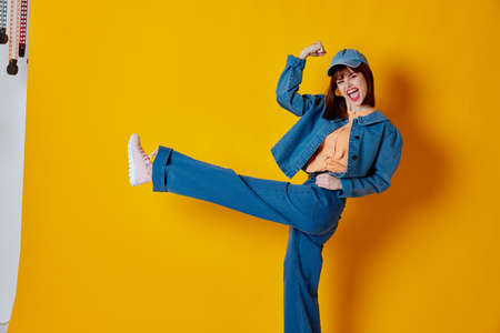 Young woman. Girl stands with her leg raised. Concept - gymnastics. Woman doing gymnastics in casual wear. Cheerful female student on yellow background. Happy woman stands on one leg