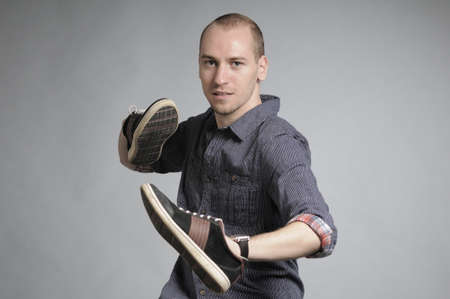The man is kicking. Foot with a shoe close-up. a man draws an opponent with a boot.