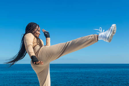 Portrait of young beautiful black afro girl training, throwing a kick, blue sky and sea background, attitude and inspiration, motivation, positivity, energy.