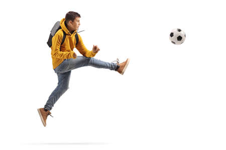 Full length profile shot of a male teenager jumping and kicking a soccer ball isolated on white background