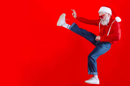 Positive modern Santa Claus, wearing stylish red hat, shirt, glasses and suspenders. Happy, old man with long white beard and mustache dancing, posing, kicking. Winter holidays celebrating concept.