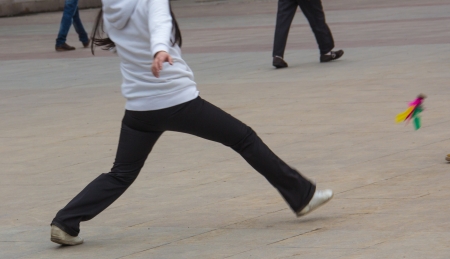 A dynamic image of a runner in gray sneakers captured mid-stride on a brick pathway. Ideal for showcasing fitness, outdoor activity, and energetic lifestyles.