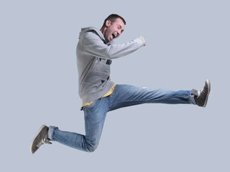 Funny cheerful happy man jumping in air over gray background