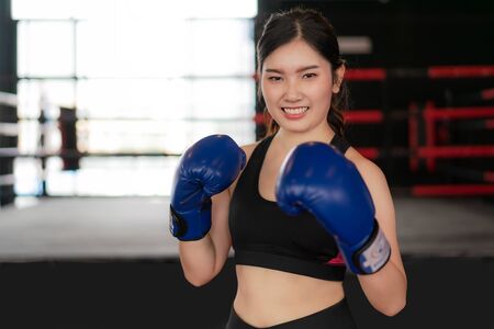 Boxer woman. Young Asian Boxing fitness woman smiling happy wearing blue boxing gloves with Boxing Stadium in background. Portrait of sporty fit for healthy lifestyle Asian model of boxing gym concept.