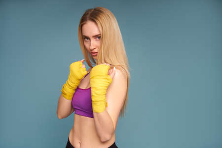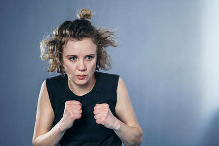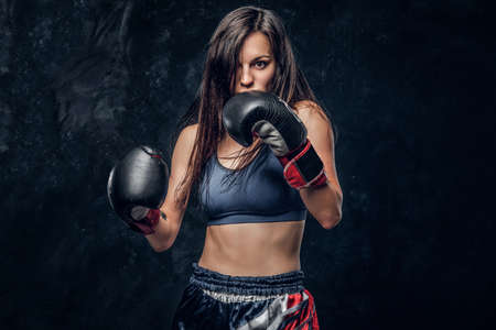 Young attractive female boxer with long hair and boxing gloves is ready to fight.