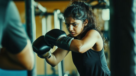 Indian woman in sportswear training in kickboxing gym in boxing gloves. self-defense sparring, box