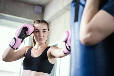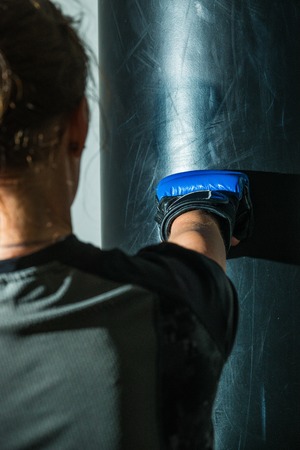 Young fighter boxer girl in training with heavy punching bag