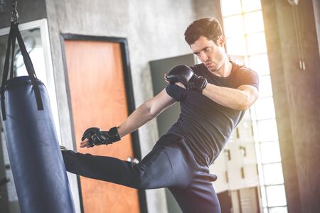Handsome man in boxing gloves punching bags exercise in fitness gym.