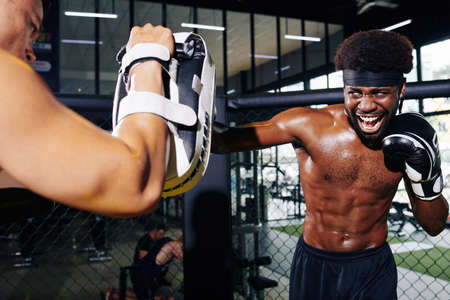 Emotional boxer training with coach and hitting punch mitts on his arm
