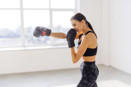 Half length of a young handsome caucasian brown hair boxer woman boxing, looking in camera - sportive, training, healthy, fitness concept