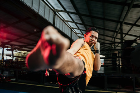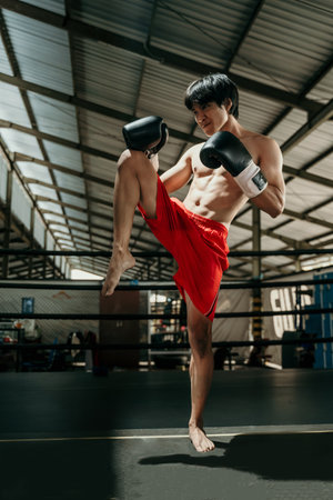 close up of muay thai boxer in boxing gloves make a middle kick