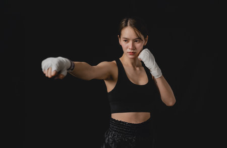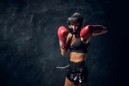 Sportsman muay thai woman boxer posing in training studio at black background.